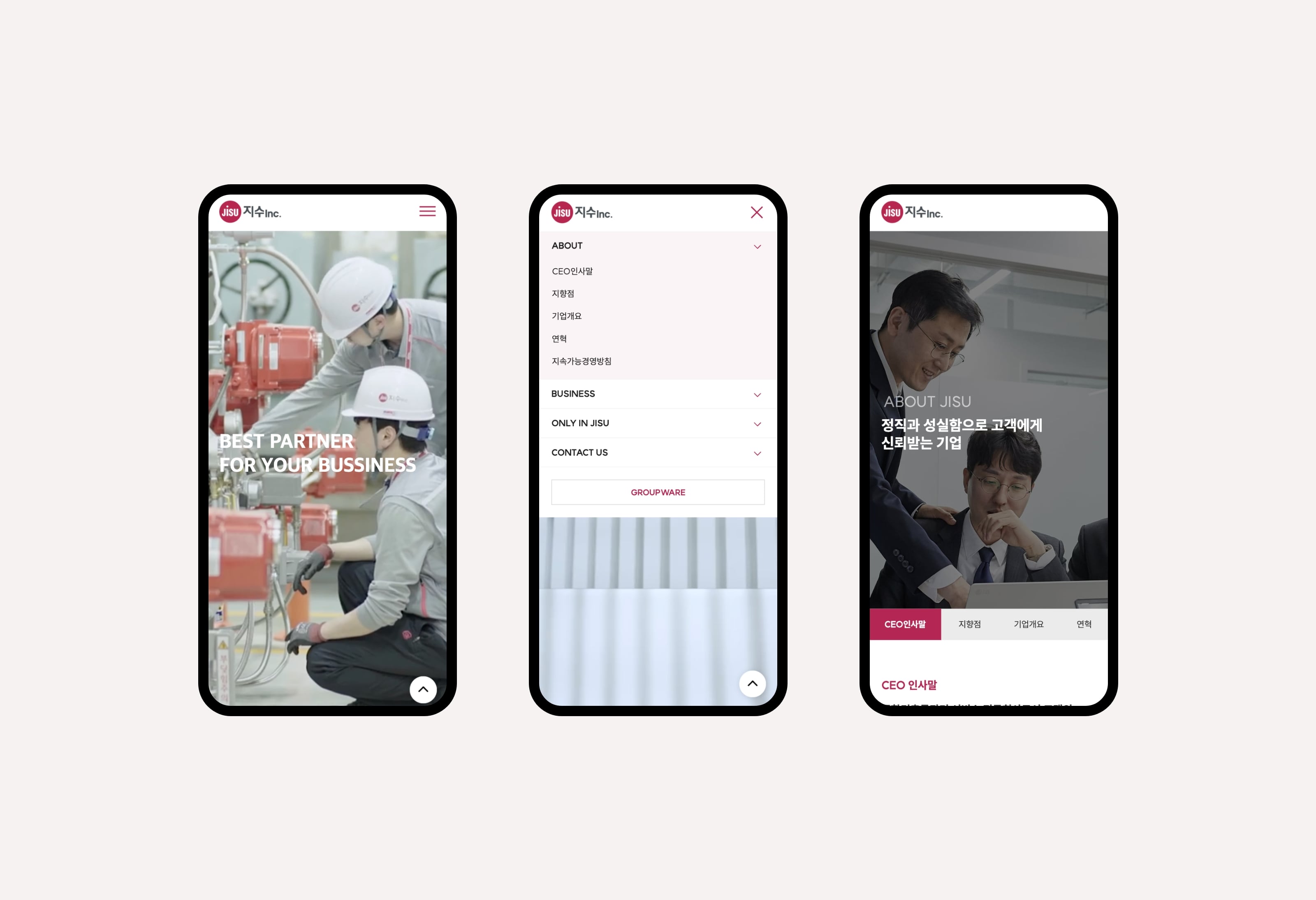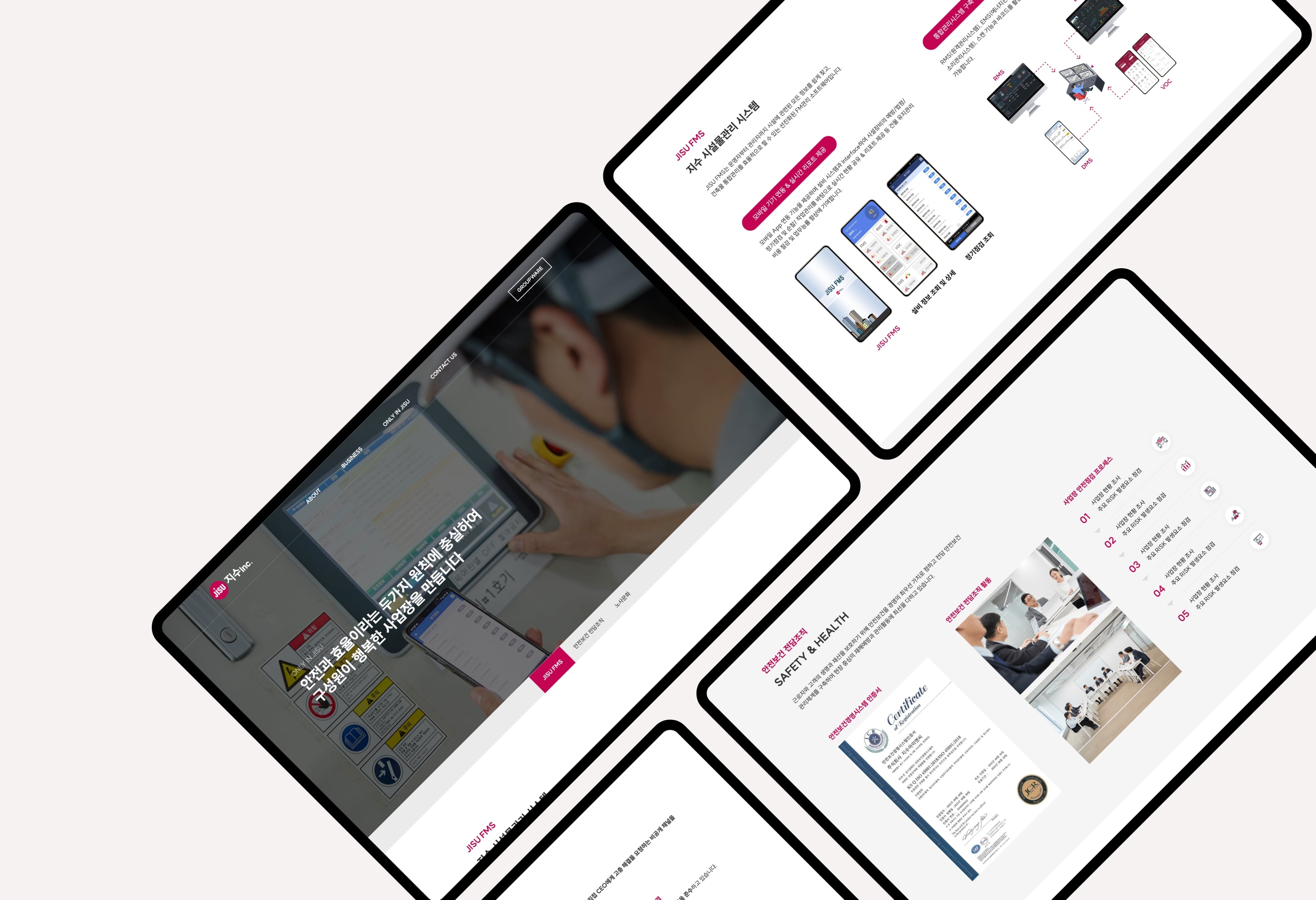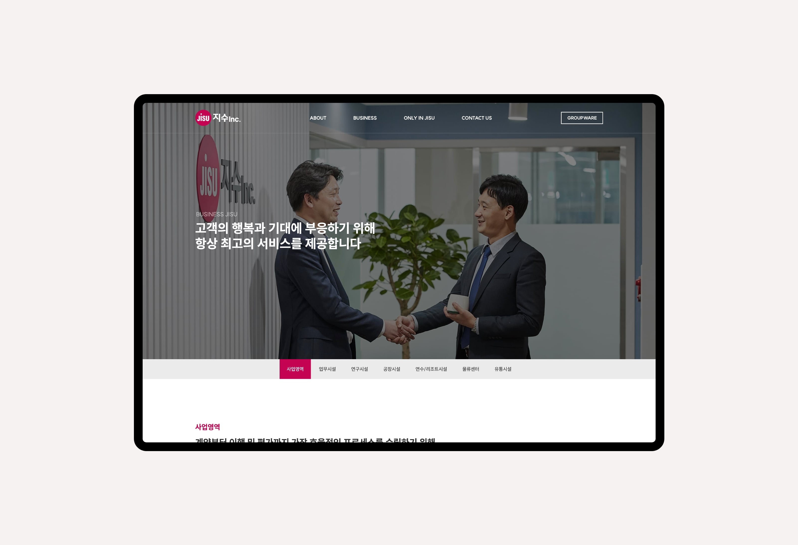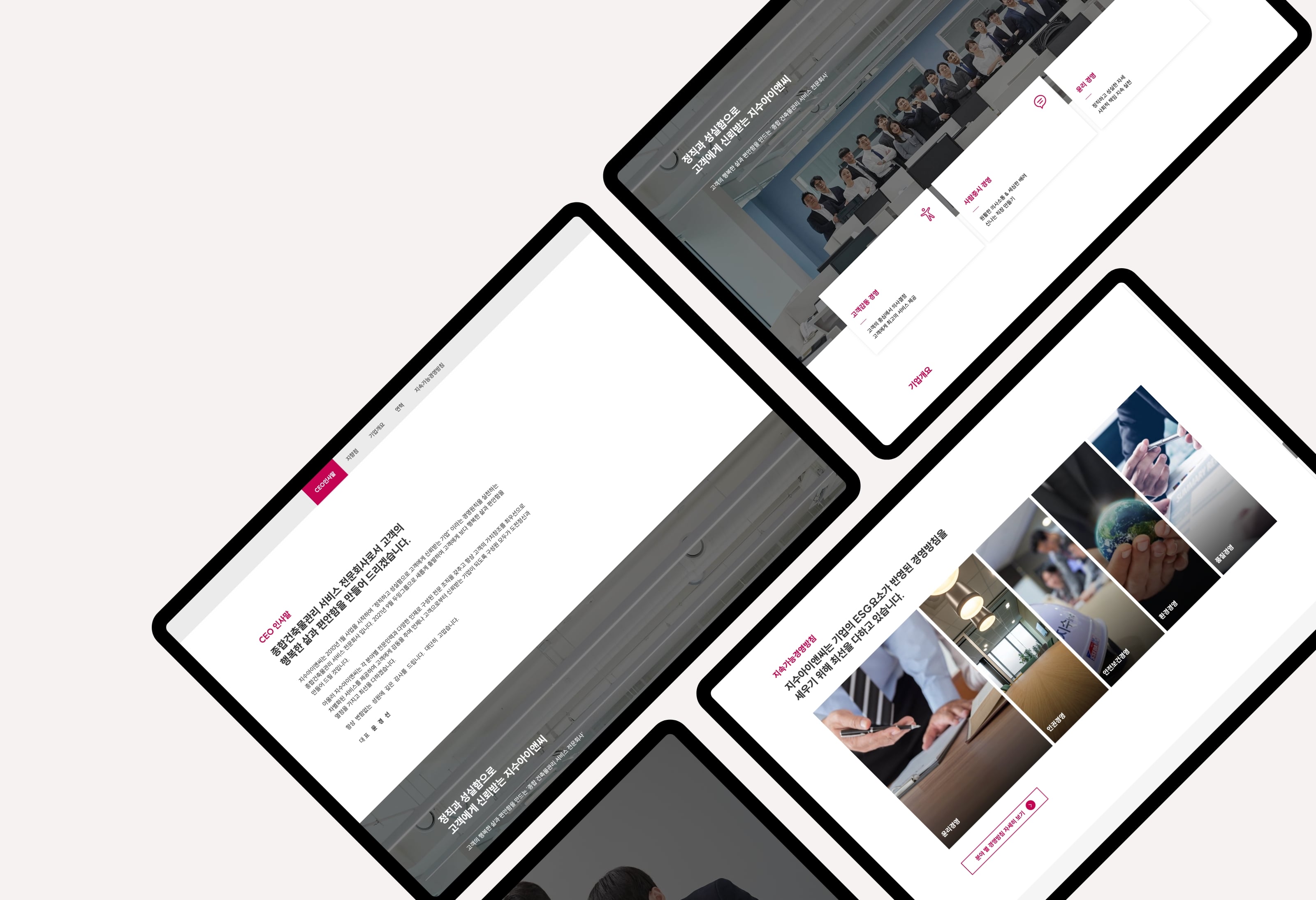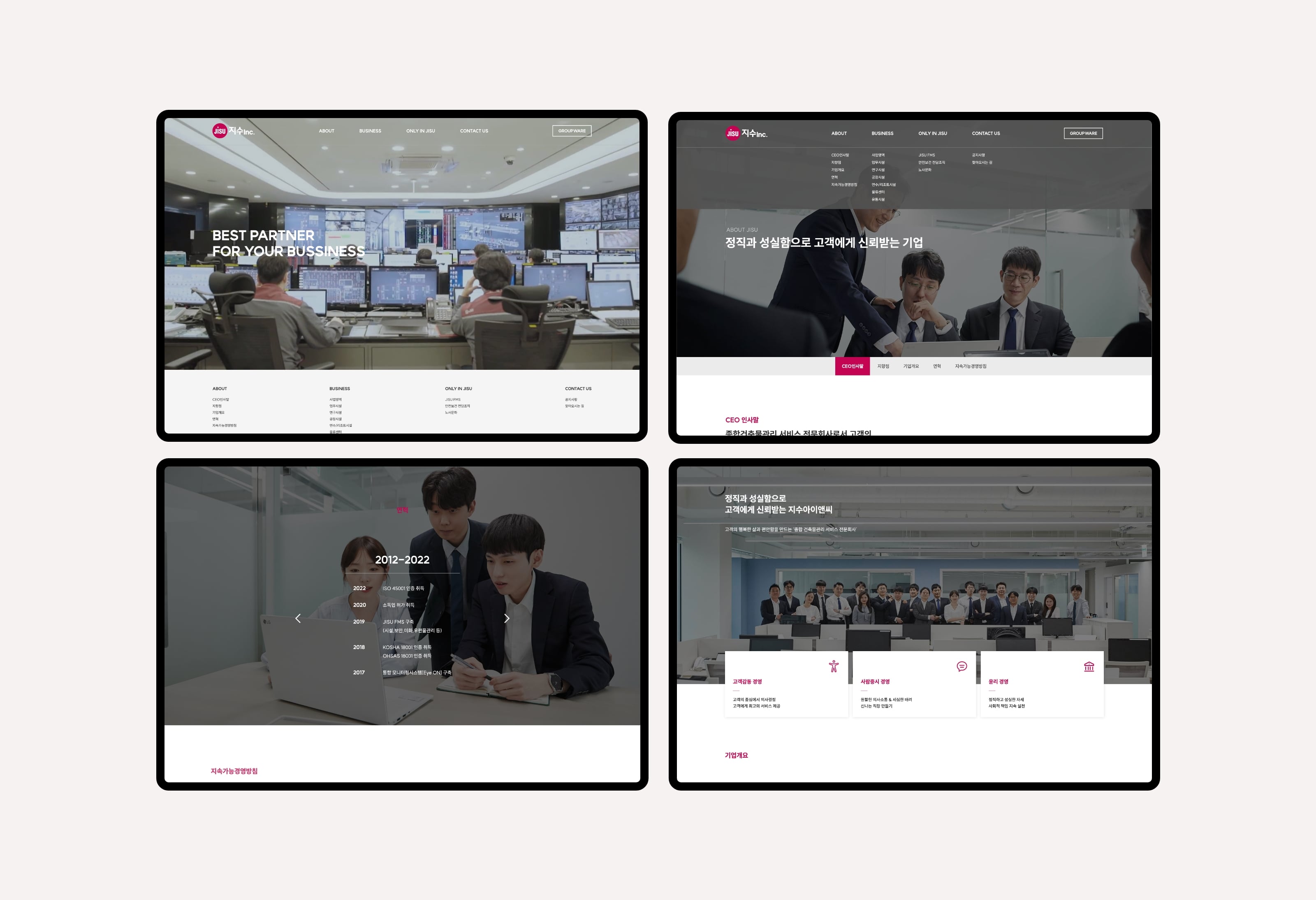 지수아이앤씨는 건물종합관리 서비스 전문회사로서 디비스에서는 브랜드 아이덴티티 확립을 위한 컬러와 웹사이트 가이드 등을 제안하였고 디자인을 해치지 않는 높은 가독성을 강조하여 스타일링 되었습니다. 공장시설, 업무시설, 연구시설 등 대형 사업장에 대한 관리 노하우를 중점으로 보여주어 고객에게 신뢰받는 모습으로 표현되었습니다.